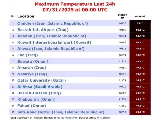 تنازل العراق، اليوم الخميس عن مرتبته الأولى في دول العالم بارتفاع درجات الحرارة، حيث ضمت القائمة خمس دول عراقية من اصل 15 مدينة عالمية.