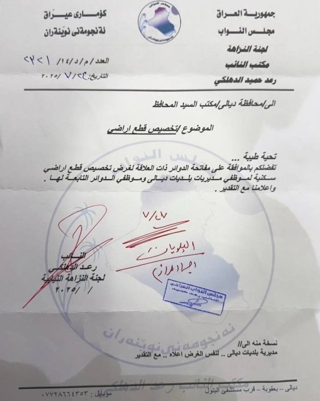 وأشارت وثيقة صادرة بتاريخ ( 24 تموز 2025) وحصلت "تنوع نيوز" على نسخة منها الى طلب مقدم من قبل عضو مجلس النواب رعد الدهلكي بشأن تخصيص قطع أراض سكنية لموظفي الدوائر البلدية".