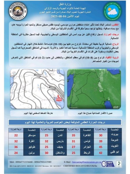 أعلنت الهيئة العامة للأنواء الجوية، اليوم الإثنين أن طقس العراق سيكون تحت تأثير امتداد منخفض حراري موسمي، وسيكون الطقس حارًا وشديد الحرارة.