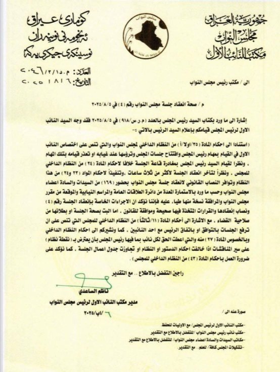 أكد النائب الأول لرئيس مجلس النواب، محسن المندلاوي، اليوم الأربعاء، أن جلسة البرلمان رقم (4) التي عقدت أمس الثلاثاء صحيحة وقانونية.أدناه نص كتاب موجه من النائب الأول إلى رئيس البرلمان: