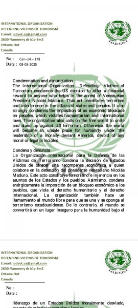 بالوثيقة :المنظمة العالمية للدفاع عن ضحايا الإرهاب تدين الموقف الأمريكي تجاه فنزويلا وتدعو العالم لمواجهته