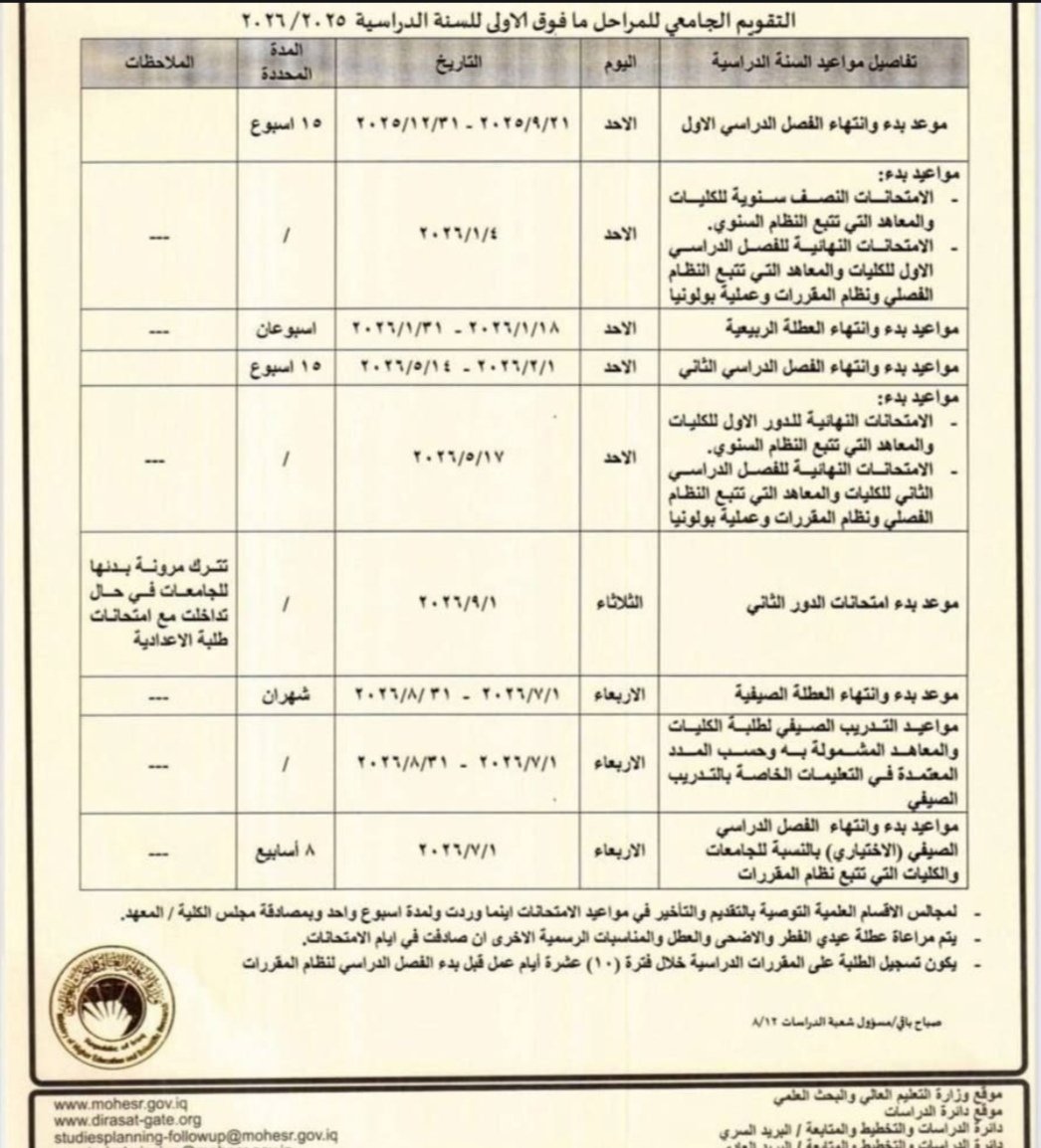 حددت وزارة التعليم العالي والبحث العلمي، اليوم الثلاثاء، موعد بدء العام الدراسي للجامعات والكليات الحكومية والاهلية للمراحل فوق الأولى.