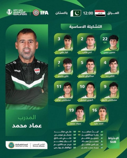 أعلن الاتحاد العراقي، اليوم الأربعاء، التشكيلة الأساسية للمنتخب الأولمبي الذي يقوده المدرب عماد محمد لمواجهة باكستان ضمن تصفيات آسيا تحت سن 23 عاماًوفيما يلي تشكيلة الفريق كما وردت لوكالة "تنوع نيوز"