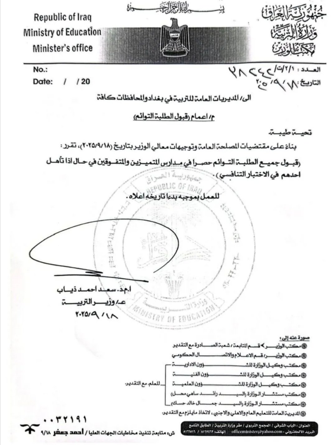 وجه وزير التربية، بقبول جميع الطلبة التوائم (حصرا) في مدارس المتميزين والمتفوقين في حال تأهل احدهما في الاختبار التنافسي.