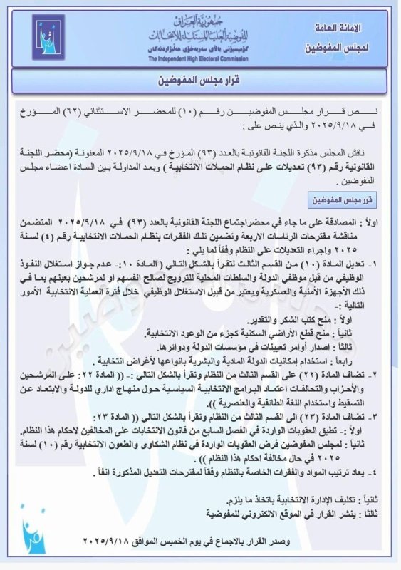 "تفعيل قوانين المخالفات: تم إضافة مادة جديدة لتطبيق أحكام قانون الانتخابات بحق المخالفين، ومنح لجنة المفوضين صلاحيات واسعة في نظام الشكاوى والطعون"![]()