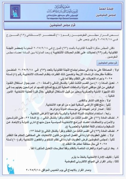 أقرت مفوضية الانتخابات، اليوم الأحد، قراراً جديداً يتضمن تعديلات على النظام الانتخابي، وذلك بهدف تعزيز نزاهة العملية الانتخابية.