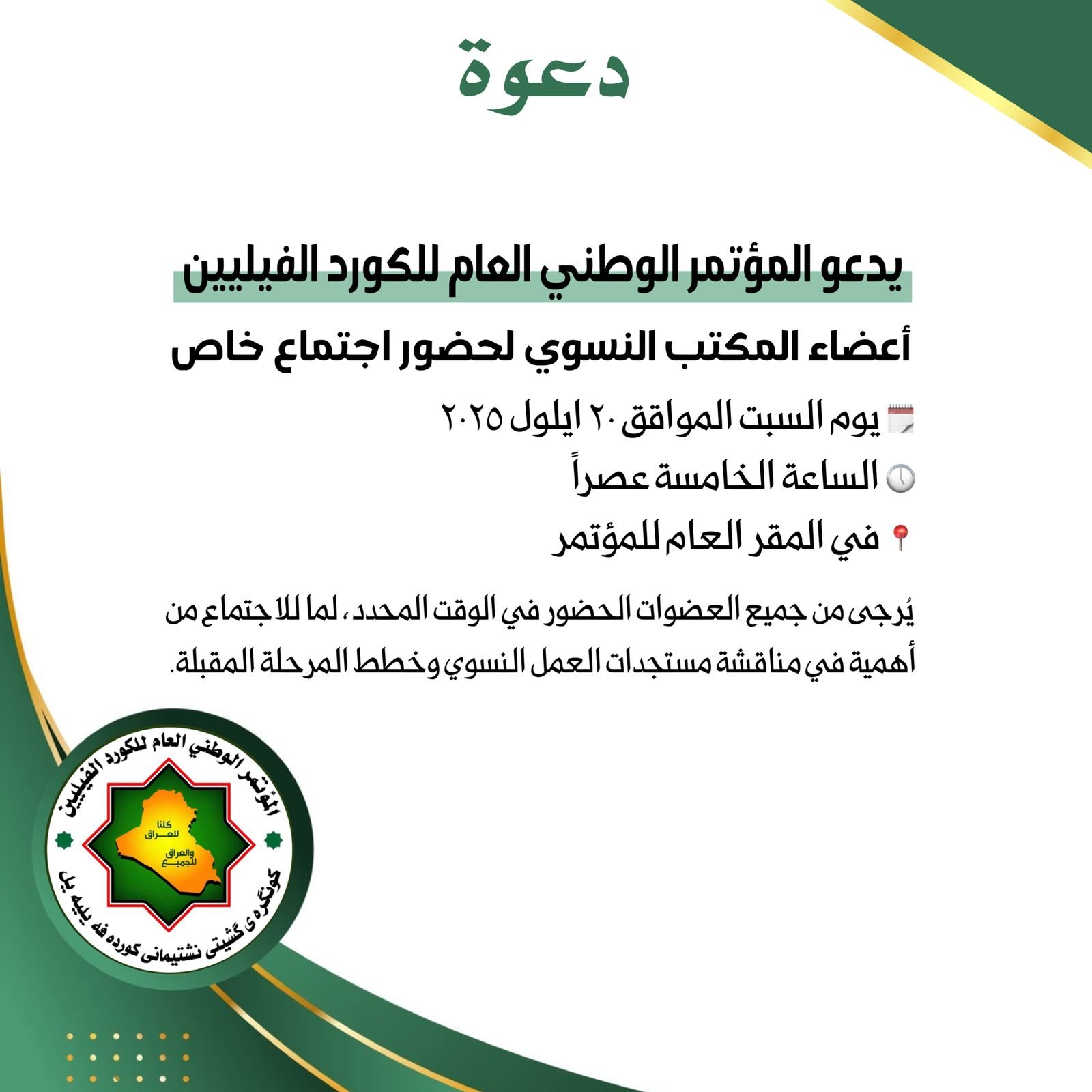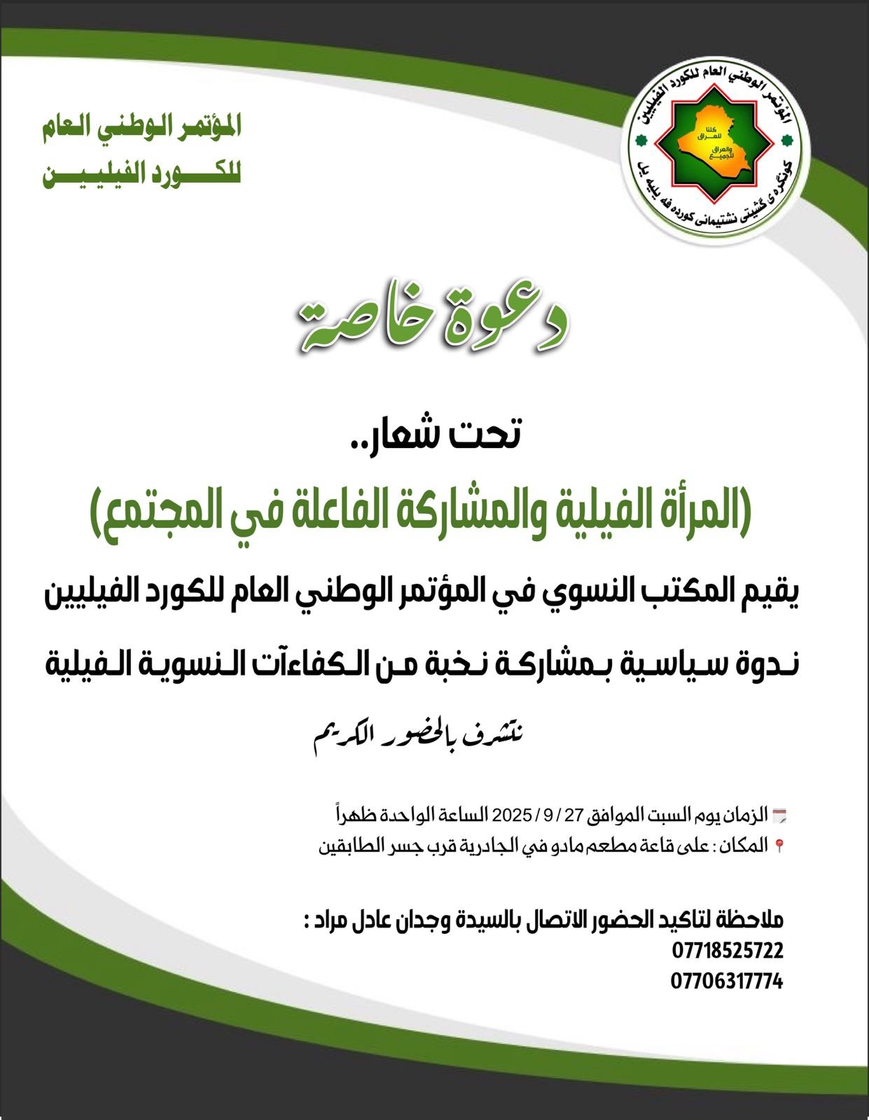 وتطرق إلى أن المكتب النسوي للمؤتمر يعقد حالياً اجتماعاً مهماً يأتي تتويجاً للمؤتمر الثالث الذي عُقد قبل أشهر، حيث يُتوقع أن يخرج هذا الاجتماع برؤى واستراتيجيات تعزز دور المرأة الفيلية خلال السنوات الأربع المقبلة، مع العمل على تشكيل هيكلية واضحة للمكتب النسوي.