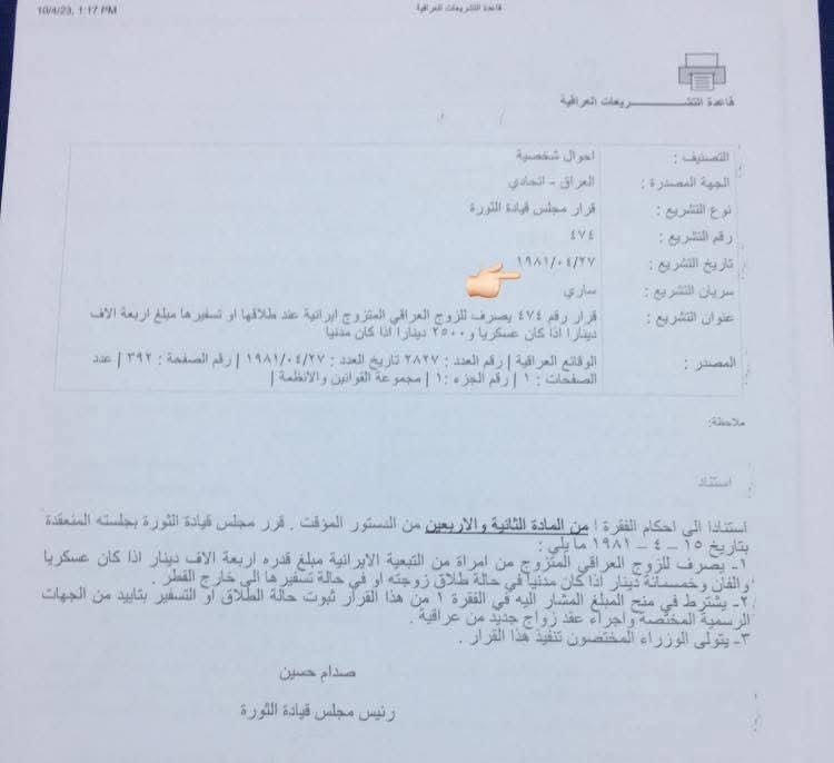 “تُسحب الجنسية العراقية من المرأة العراقية المتزوجة من رجل إيراني، أو من تبعية إيرانية، وتُرحّل إلى إيران مع أولادها.”