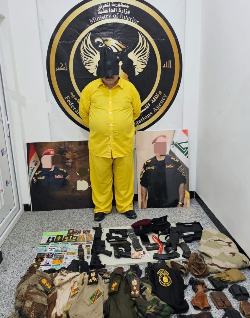 وأوضح أن "المتهم كان منتسباً سابقاً في وزارة الداخلية وتم فصله عام 2007"، لافتاً إلى أن "عملية الضبط أسفرت عن العثور بحوزته على أسلحة ومعدات عسكرية مختلفة، من بينها: 1. بندقية نوع (M4) 2. أربعة مسدسات متنوعة الأنواع إضافةً إلى بدلات عسكرية تحمل رتباً مختلفة، وباجات مزورة، وكتب رسمية ومخاطبات مزيّفة، فضلاً عن صور شخصية له وهو يرتدي الزي العسكري برتب وهمية".