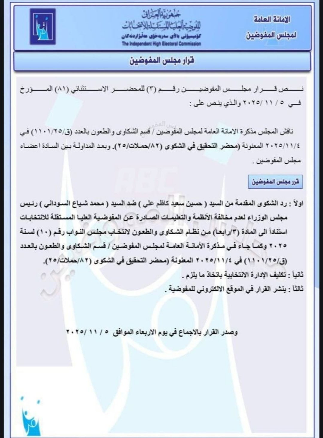 وبحسب وثيقة حصلت عليها "تنوع نيوز"، فإن "مجلس المفوضين رد شكوى النائب حسين عرب ضد رئيس الوزراء لعدم مخالفة الأنظمة والتعليمات الصادرة عن مفوضية الانتخابات، وجاء القرار استنادًا إلى المادة 3 / رابعاً من نظام الشكاوى والطعون لانتخاب مجلس النواب رقم 10 لسنة 2025"![]()
