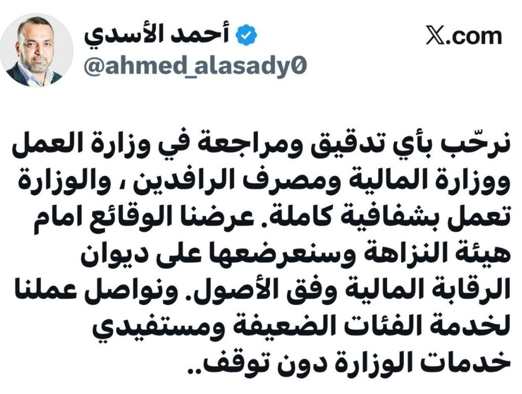 وكتب الاسدي في تدوينة تابعتها "تنوع نيوز": "نرحب بأي تدقيق ومراجعة في وزارة العمل ووزارة المالية ومصرف الرافدين ، والوزارة تعمل بشفافية كاملة" .