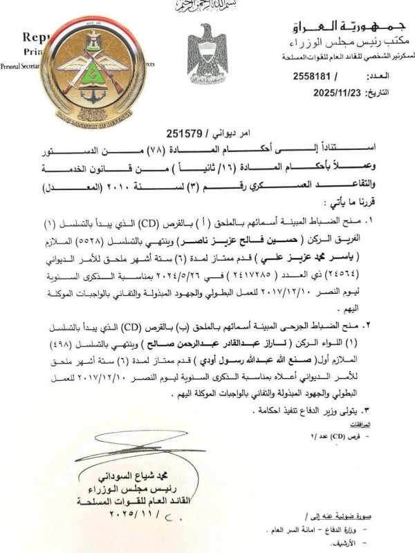 أصدر القائد العام للقوات المسلحة، رئيس الوزراء محمد شياع السوداني، أمراً بمنح قدم لمدة 6 أشهر لعدد كبير من الضباط في وزارتي الداخلية والدفاع وجهاز مكافحة الإرهاب، تقديراً لجهودهم وتضحياتهم بمناسبة الاحتفالات بيوم النصر العراقي 10 كانون الأول المقبل.