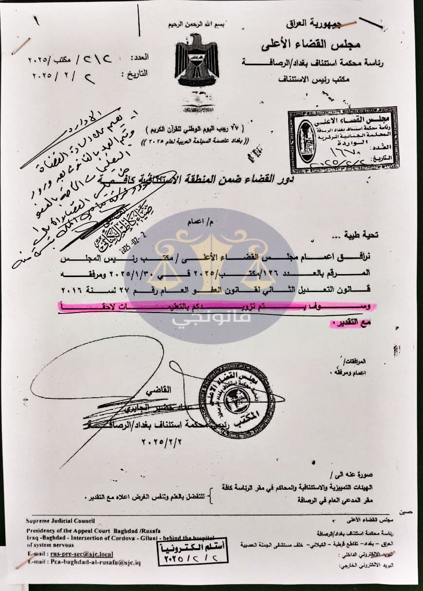 وشدد على "أهمية تنظيم وترتيب الأضابير الجزائية عند إرسالها إلى الهيئة الجزائية، بهدف الحد من حالات إحالة الدعاوى بين محاكم الجنح، لاسيما القضايا المهيأة للحسم، بما يسهم في منع التأخير وإنجاز الملفات ضمن السقوف الزمنية المحددة"