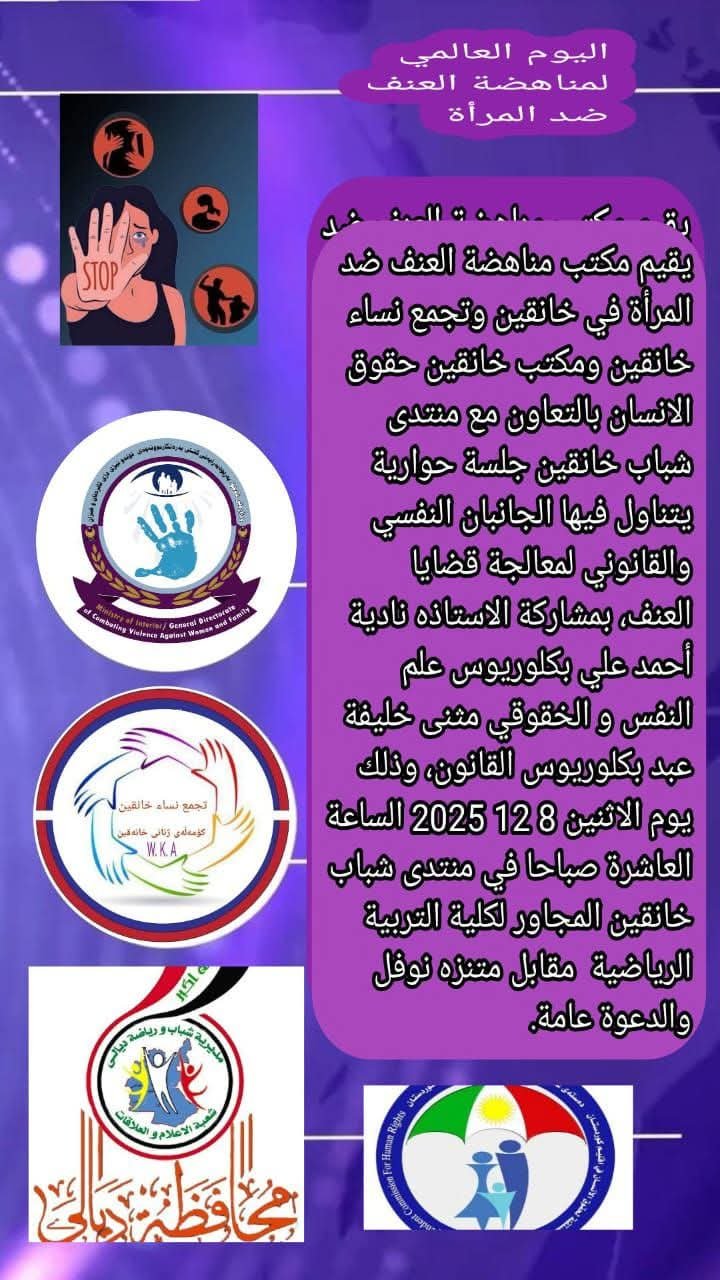 عقدت الشرطة المجتمعية في محافظة ديالى / قضاء خانقين، وبالتعاون مع لجنة مكافحة التطرف ومنظمة الابتهال لحقوق الإنسان في ناحية جلولاء، جلسة توعوية موسعة تناولت موضوع العنف ضد المرأة والعنف الأسري بجميع أشكاله، مع التركيز على سبل التعامل معه والحدّ من آثاره داخل المجتمع.