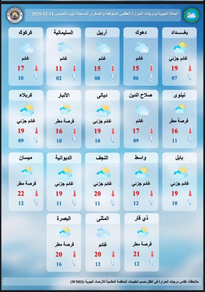 أصدرت الهيئة العامة للأنواء الجوية والرصد الزلزالي، اليوم الخميس الموافق 11 كانون الأول 2025، نشرتها الجوية المحدثة التي تتضمن توقعات الطقس للأيام المقبلة، مؤكدة أنها ستواصل تحديث المعلومات بشكل يومي بحسب مستجدات الحالة الجوية.