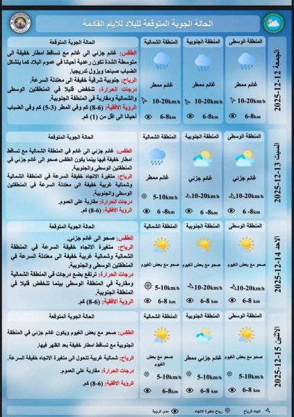 وأوضحت الهيئة أن البلاد ستشهد تقلبات جوية متفاوتة الشدة، ترافقها فرص لهطول الأمطار في عدد من المناطق، مع التحذير من تشكّل الضباب وانخفاض مدى الرؤية في ساعات الصباح الباكر. كما أشارت إلى احتمال تأثر بعض المحافظات بموجات رياح نشطة قد تؤثر على الحركة الجوية والبرية.
