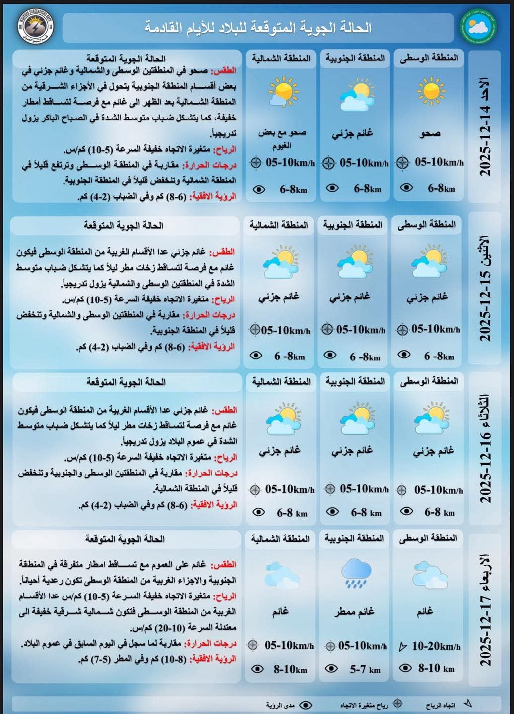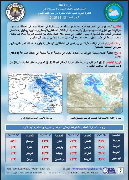 أعلنت وزارة النقل، عبر الهيئة العامة للأنواء الجوية والرصد الزلزالي / قسم التنبؤ الجوي، النشرة الجوية الخاصة ليوم السبت الموافق 13 كانون الأول والأيام التي تليه، مؤكدةً أن هذه النشرة يتم تحديثها يوميًا وفق مستجدات الحالة الجوية، بمشيئة الله تعالى.