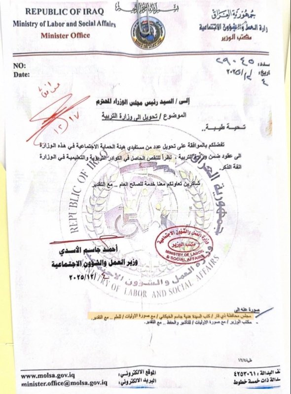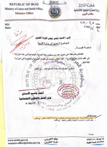 وتأتي موافقة السوداني في تهميشه على كتاب لوزير العمل تلقته "تنوع نيوز"، يطلب فيه تحويل المستفيدين من هيئة الحماية الاجتماعية للعمل بصفة عقود ضمن وزارة التربية.