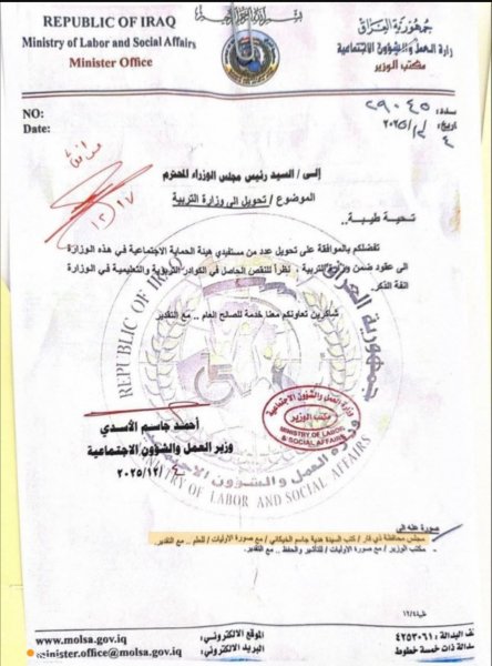 وأضاف الأسدي في بيان ورد لـ"الغد برس"، أن "إجراءات التحويل تنفذ وفق ضوابط ومعايير واضحة تضمن العدالة والشفافية في اختيار المشمولين، وبما ينسجم مع احتياجات وزارة التربية من الملاكات الإدارية"، مبيناً أن "هذه الخطوة تمثل انتقالاً نوعياً في سياسات الرعاية الاجتماعية".![]()