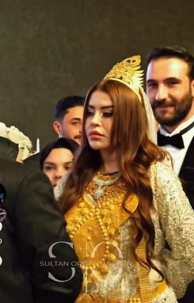 وفي مشهد أثار دهشة الحاضرين، زُيّنت العروس بكيلوغرامات من الذهب، شملت عملات ذهبية، وحزامًا ذهبيًا، وقلائد متعددة، وخاتم ألماس، إضافة إلى تاج ذهبي، ما اضطرها إلى الجلوس بعد فترة قصيرة من الرقص بسبب ثقل المجوهرات.