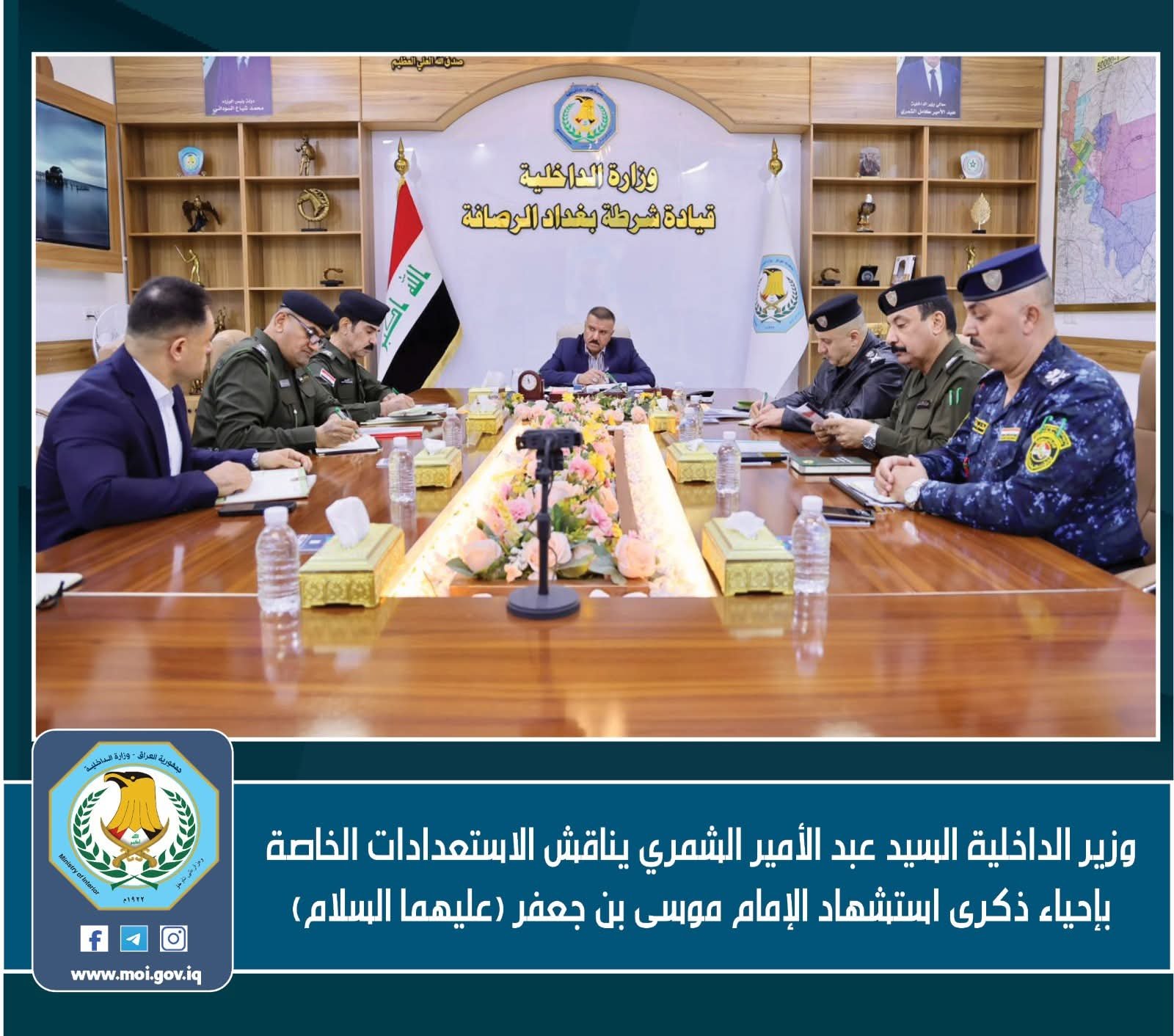 ناقش وزير الداخلية، السيد عبد الأمير الشمري، الاستعدادات الأمنية والتنظيمية الخاصة بإحياء ذكرى استشهاد الإمام موسى بن جعفر عليه السلام، وذلك خلال اجتماع موسّع مع القيادات الأمنية والدوائر المختصة في الوزارة.
