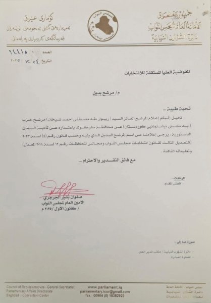 وبحسب وثيقة رسمية صادرة عن الأمانة العامة لمجلس النواب وموقعة من الأمين العام صفوان بشير الجبوري بتاريخ 24 كانون الأول 2025، فقد تم إشعار المفوضية العليا المستقلة للانتخابات باعتذار طالباني عن مقعده النيابي، وطلب ترشيح البديل وفق السياقات القانونية.