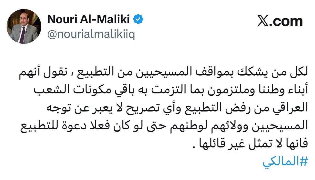 أكد رئيس ائتلاف دولة القانون نوري المالكي، في منشور له على منصة X، أن المكوّن المسيحي في العراق يلتزم بالموقف الوطني الرافض للتطبيع مع إسرائيل، شأنه شأن باقي مكونات الشعب العراقي.