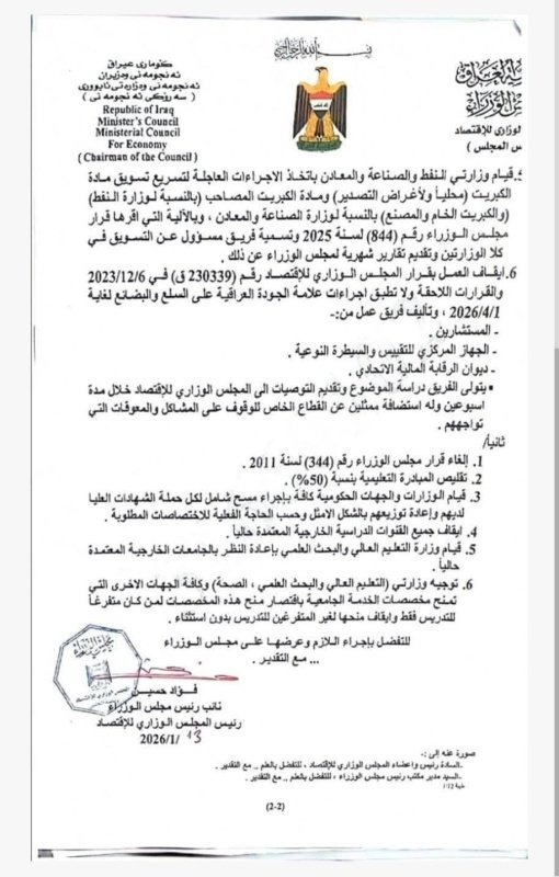 وجه مجلس الوزراء الاقتصادي بإلغاء علاوة 50% لخريجي الدراسات العليا، بحسب وثيقة حصلت عليها "بغداد اليوم"، اليوم الجمعة ( 16 كانون الثاني 2026 )، كما هو موضح بنص الوثيقة أدناه: