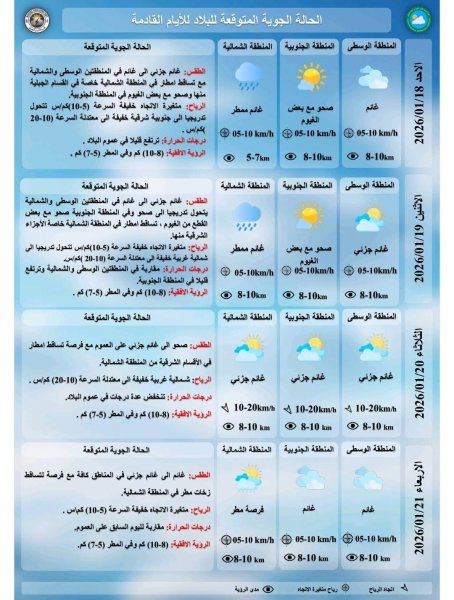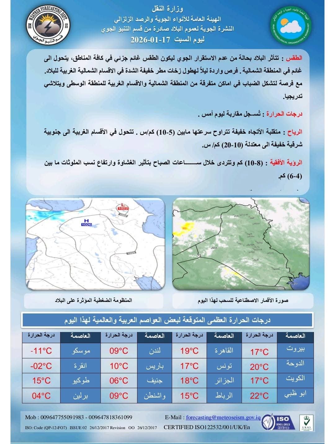 أصدرت الهيئة العامة للأنواء الجوية والرصد الزلزالي العراقية توقعاتها لحالة الطقس اليوم السبت 17 كانون الثاني 2026، حيث يُتوقع أن يكون الطقس مشمسًا جزئيًا مع ظهور بعض السحب العالية، وتصل درجات الحرارة العظمى إلى 15°م والصغرى إلى 6°م.