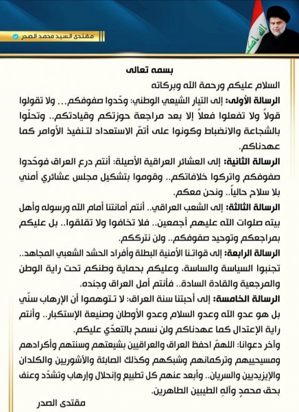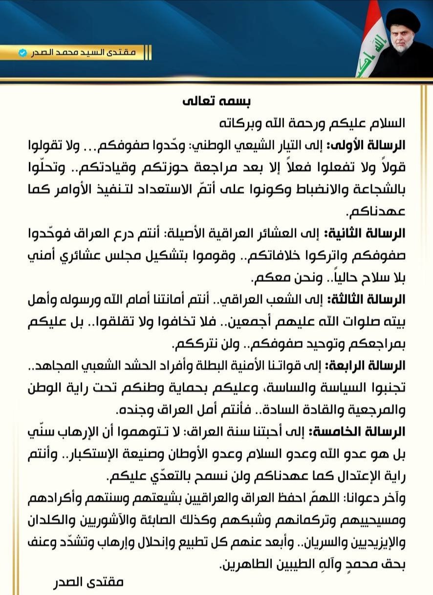 وجه زعيم التيار الشيعي الوطني السيد مقتدى الصدر، اليوم الثلاثاء، 5 رسائل إلى تياره والعشائر العراقية والشعب العراقي والقوات الأمنية وسنة العراق بشأن ما يحصل من أحداث أمنية في المنطقة.أدناه نص التغريدة: