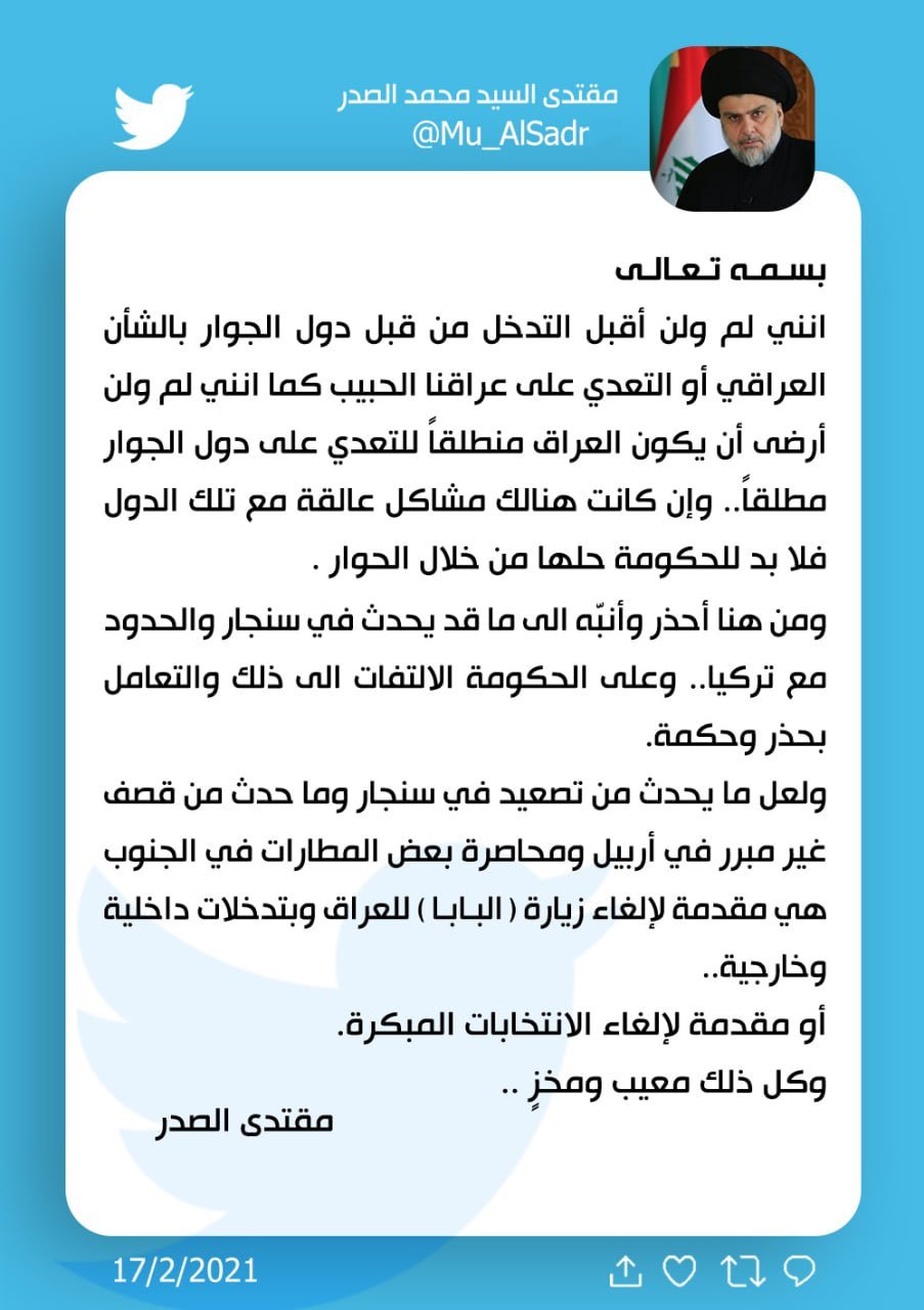 وقال السيد الصدر في منشور على مواقع التواصل الاجتماعي انه لن يقبل على التدخل من قبل دول الجوار في الشأن العراقي، او التعدي على العراق الجبيب.