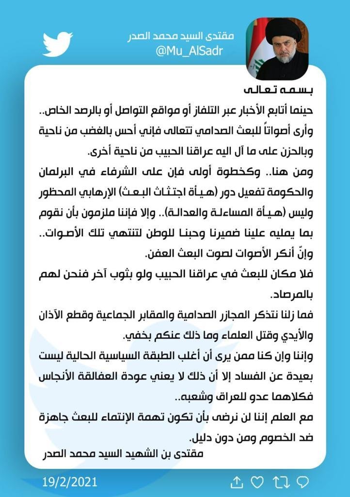 وقال الصدر في تغريدة له عبر تويتر: "حينما أتابع الأخبار عبر التلفاز أو مواقع التواصل أو بالرصد الخاص وأرى أصواتاً للبعث الصدامي تتعالى فأنني أحس بالغضب من ناحية والحزن على ما آل اليه عراقنا الحبيب من ناحية أخرى".