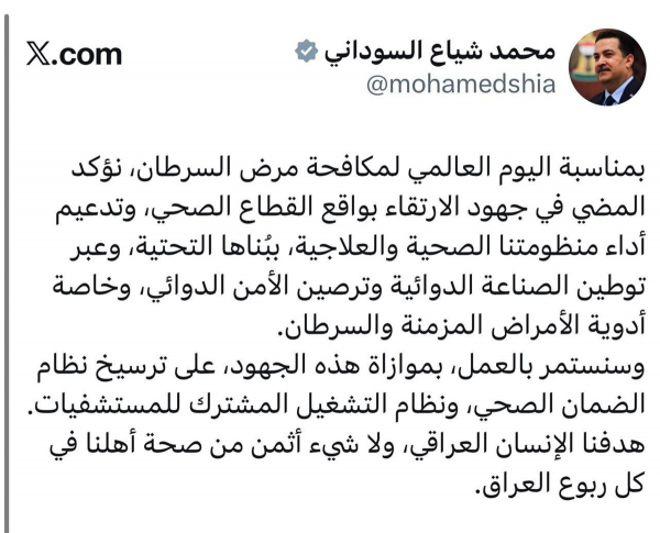 السوداني: بمناسبة اليوم العالمي لمكافحة السرطان نؤكد المضي بجهود الارتقاء بواقع القطاع الصحي