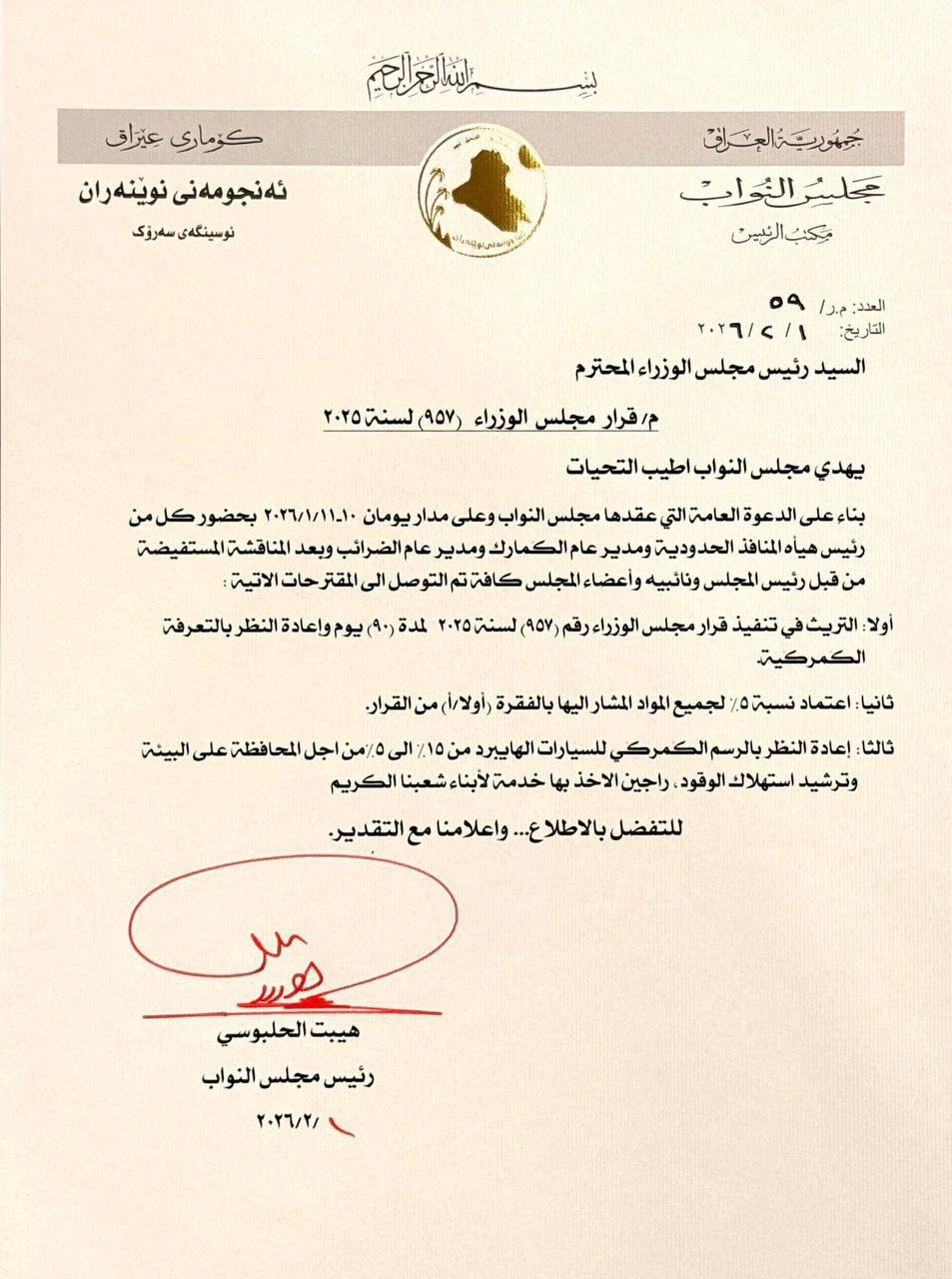 ونص كتاب صدر بتوقيع رئيس مجلس النواب هيبت الحلبوسي، موجه إلى رئيس مجلس الوزراء، على ثلاثة مقترحات أشار إلى أنّ البرلمان توصل إليها بعد مناقشات شارك فيها كل من رئيس هيئة المنافذ الحدودية ومدير عام الجمارك ومدير عام الضرائب، وكما يلي: