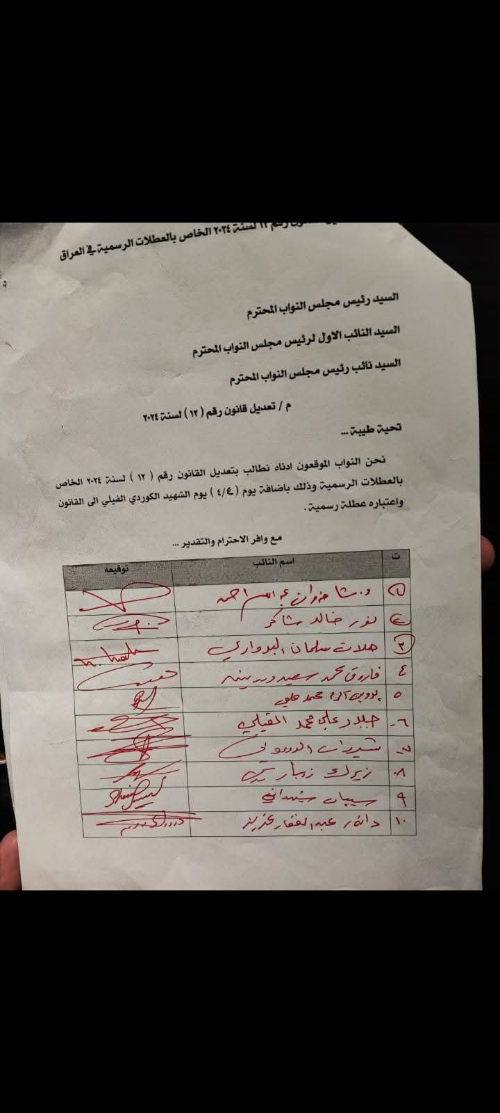 أعلن ممثل الكورد الفيليين في مجلس النواب، النائب حيدر أبو تارة، عن تقديم طلب رسمي إلى رئاسة المجلس لتعديل القانون واستحداث يوم خاص بـ"الشهيد الكوردي الفيلي" وجعله عطلة رسمية في البلاد.