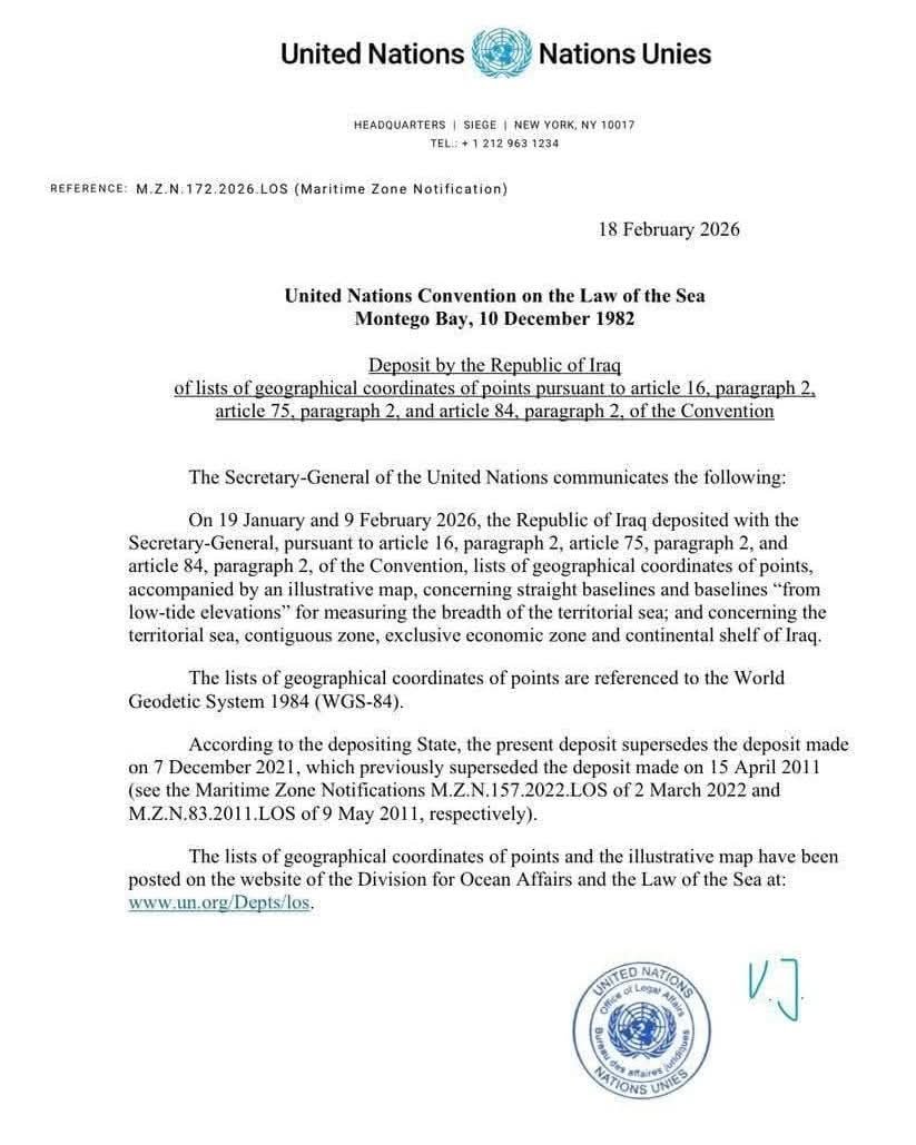 أعلن عضو مجلس النواب حيدر السلامي عن إيداع خارطة المجالات البحرية العراقية ونشرها رسميًا على موقع الأمم المتحدة، في خطوة وصفها بالمهمة لضمان وتثبيت حقوق العراق السيادية.