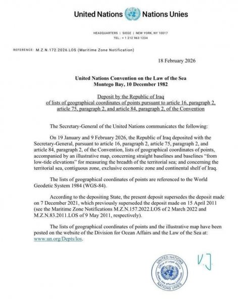 وأوضح السلامي أن إيداع الخارطة يمثل إجراءً قانونيًا يعزز حق العراق في الدفاع عن حدوده ومجالاته البحرية وفق القوانين والأعراف الدولية، مشيرًا إلى أن هذه الخطوة تكتسب أهمية خاصة فيما يتعلق بمنطقة خور عبد الله.
