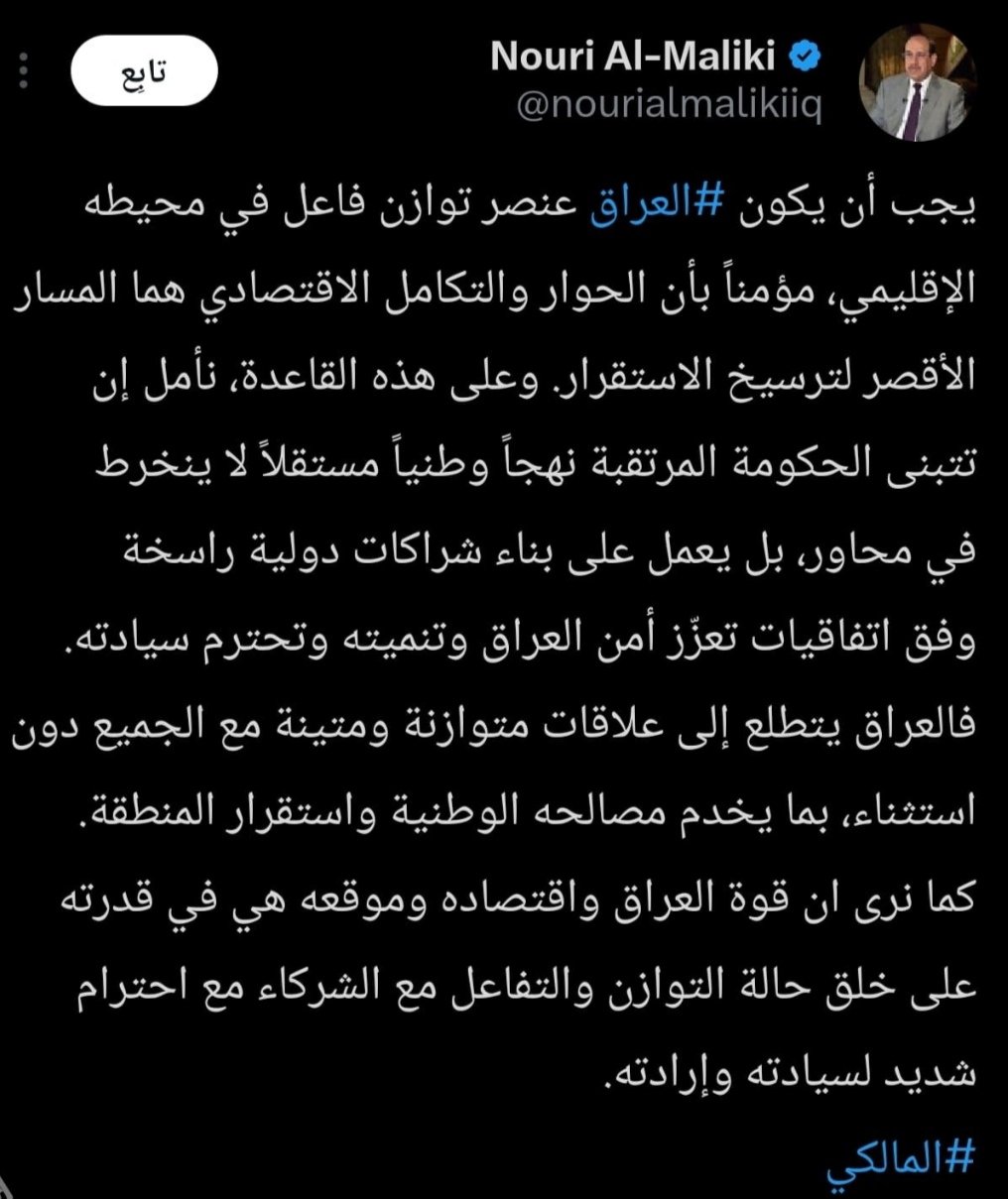 وقال المالكي، في تدوينة على منصة (X) تابعتها وكالة "تنوع نيوز" : "يجب أن يكون العراق عنصر توازن فاعل في محيطه الإقليمي، مؤمناً بأن الحوار والتكامل الاقتصادي هما المسار الأقصر لترسيخ الاستقرار"، معرباً عن أمله أن "تتبنى الحكومة المرتقبة نهجاً وطنياً مستقلاً لا ينخرط في محاور، بل يعمل على بناء شراكات دولية راسخة وفق اتفاقيات تعزّز أمن العراق وتنميته وتحترم سيادته".