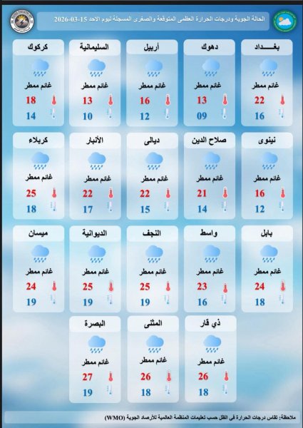 أعلنت الهيئة العامة للأنواء الجوية والرصد الزلزالي العراقية التابعة لوزارة النقل، اليوم الأحد 15 آذار 2026، أن البلاد ستبقى تحت تأثير حالة من عدم الاستقرار الجوي نتيجة اندفاع منخفض جوي من جهة الغرب.