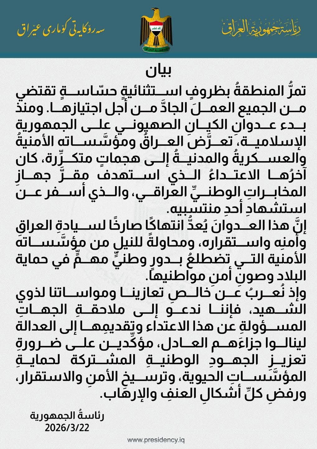 دان المجلس الأعلى الإسلامي العراقي الاعتداء السافر على جهاز المخابرات الوطني، واصفاً إياه بالعمل الإرهابي الذي يستهدف زعزعة الأمن والاستقرار في البلاد.
