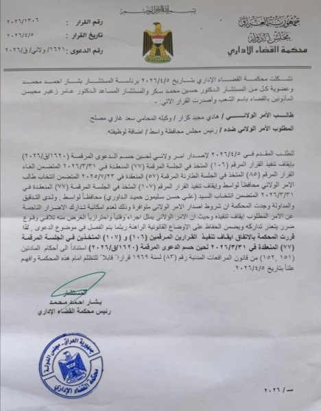 وبحسب وثيقة صادرة عن المحكمة حصلت عليها "تنوع نيوز"، فإن القرار تضمن إيقاف تنفيذ القرارين المرقمين (106) و(107)، الصادرين خلال الجلسة المرقمة (77) المنعقدة بتاريخ 31 آذار 2026، وذلك إلى حين حسم الدعوى المرقمة (1620/2026)، واستندت المحكمة في قرارها إلى أحكام المادتين (151 و152) من قانون المرافعات المدنية رقم (83) لسنة 1969، مشيرةً إلى أن القرار قابل للتظلم أمام المحكمة ذاتها![]()