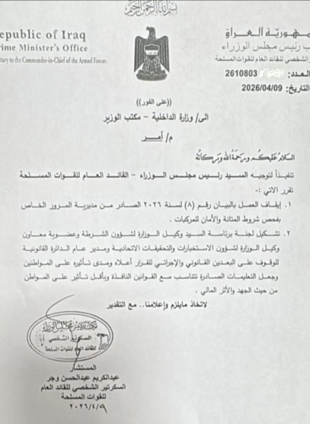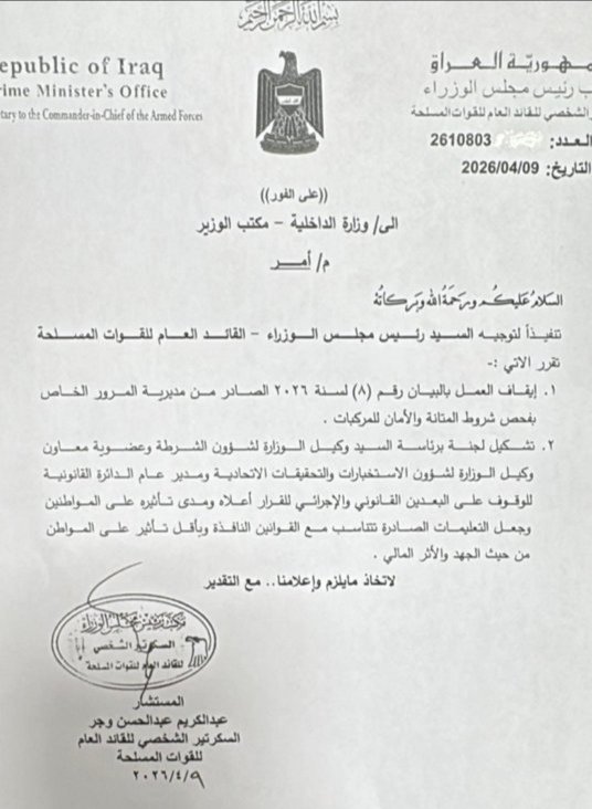 ووفقا لوثيقة صادرة من السكرتير الشخصي للقائد العام للقوات المسلحة حصلت عليها وكالة"تنوع نيوز" أنه "تنفيذا لتوجيه رئيس مجلس الوزراء القائد العام للقوات المسلحة، تقرر إيقاف العمل بالبيان رقم (8) لسنة 2026 الصادر من مديرية المرور، الخاصة بفحص شروط المتانة والأمان للمركبات".