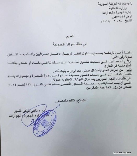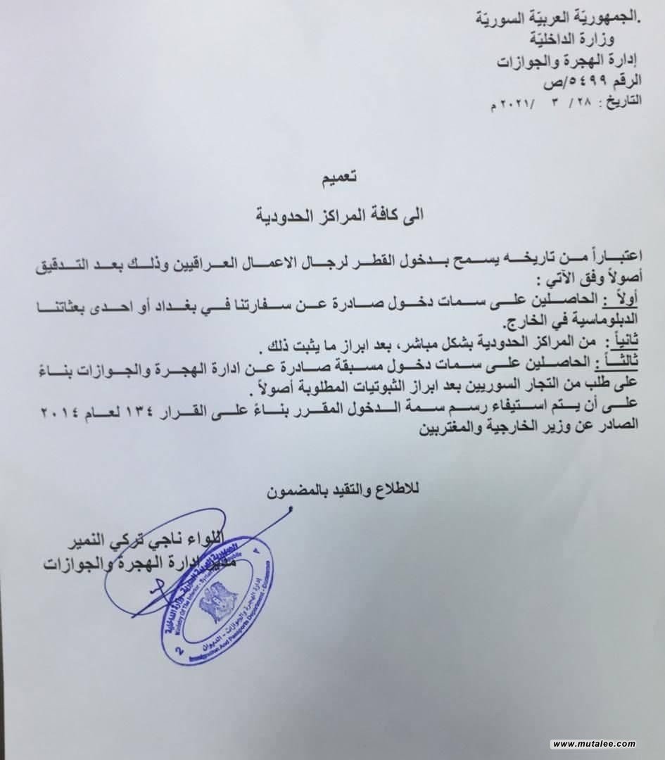 أصدرت ادارة الهجرة والجوازات التابعة لوزارة الداخلية السورية تعليمات جديدة تخص دخول التجار العراقيين.
