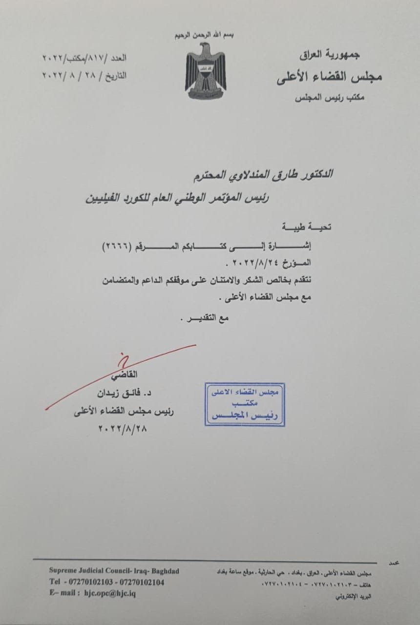 رئيس مجلس القضاء الاعلى الدكتور القاضي فائق زيدان يشكر ويثمن دور الدكتور طارق المندلاوي رئيس المؤتمر الوطني العام للكورد الفيليين