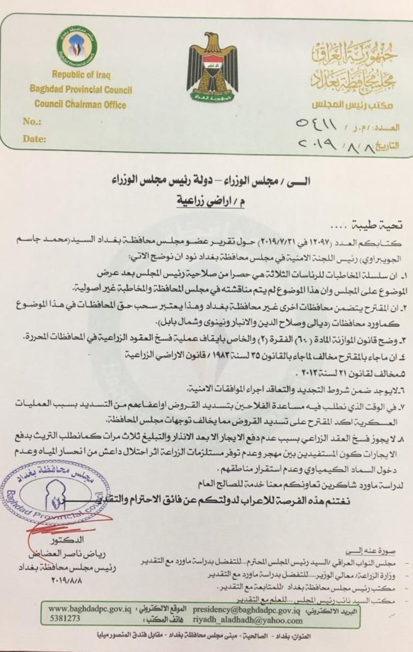 رئيس مجلس محافظة بغداد #رياض_العضاض يخاطب رئيس الوزراء بشأن عقود الأراضي الزراعية.