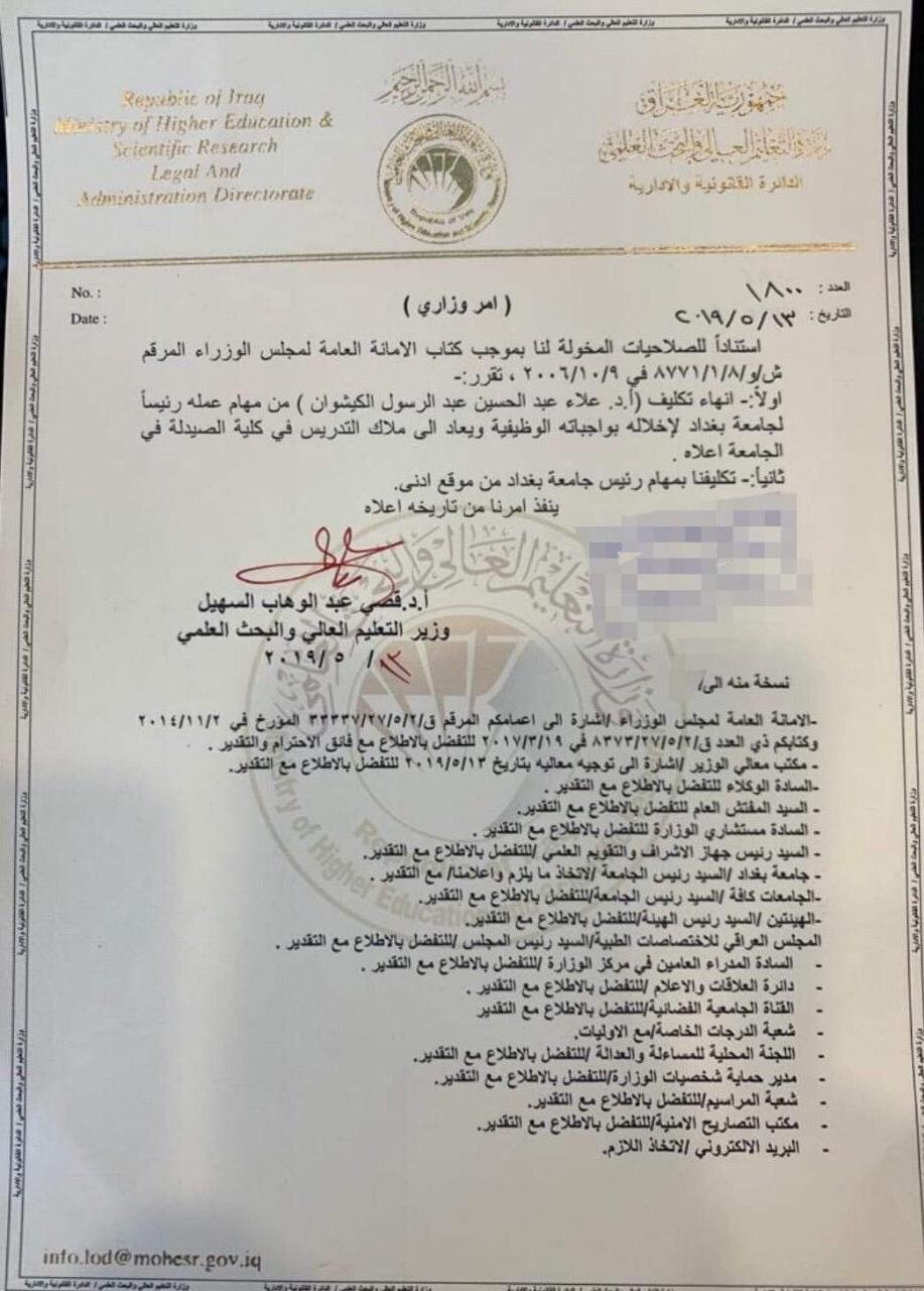 كتاب انهاء تكليف رئيس جامعة بغداد من مهام عمله