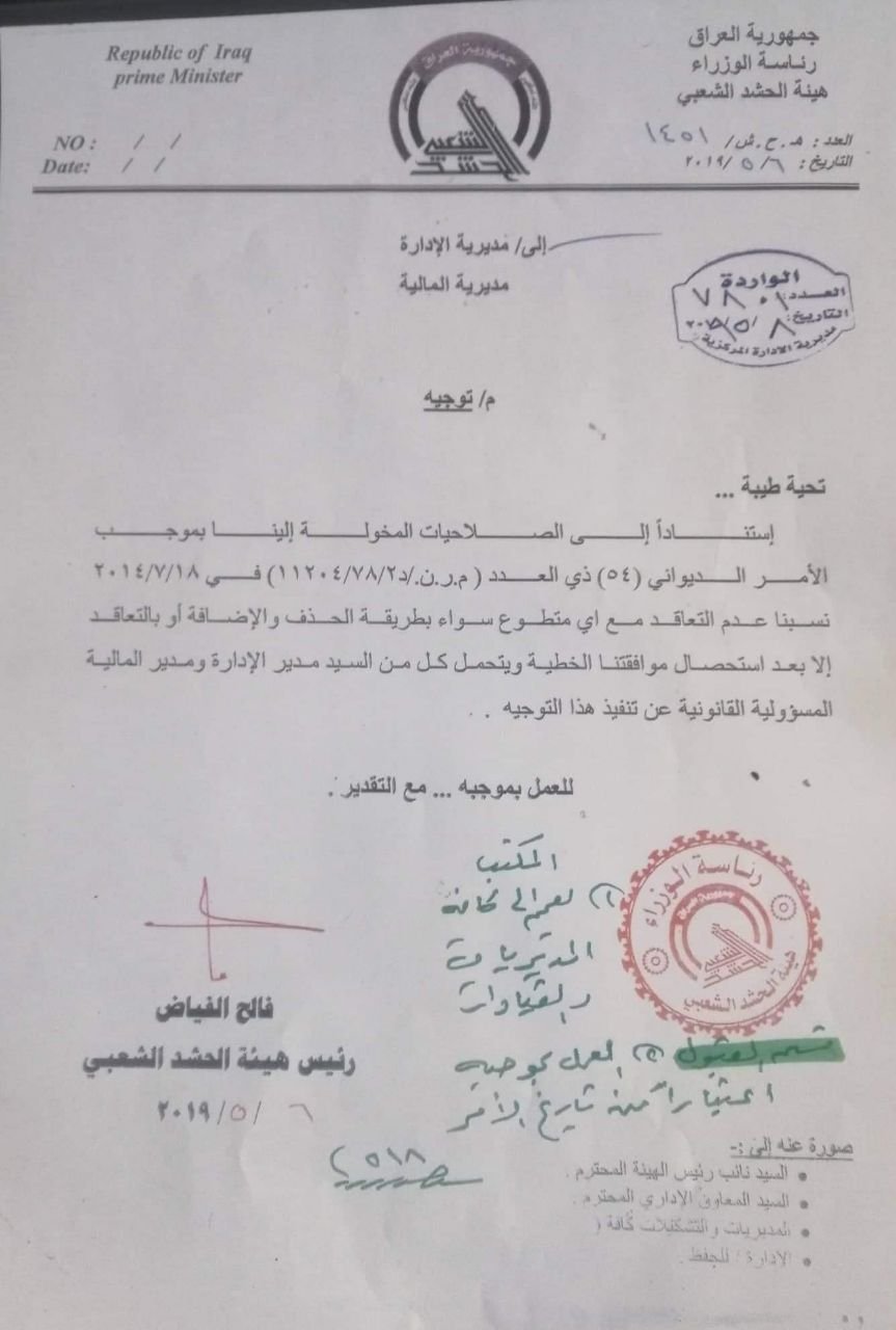 #بالوثيقة... بأمر من رئيس هيئة الحشد الشعبي الاستاذ فالح الفياض، إيقاف التعيينات على ملاك الهيئة كافة.