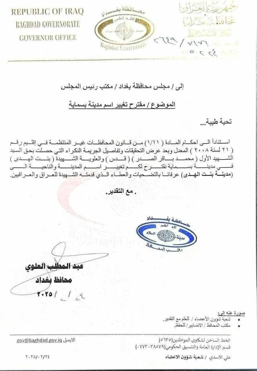 بالوثيقة: مؤسسة الشهداء تشيد بمقترح تغيير اسم مدينة بسماية إلى "مدينة بنت الهدى"