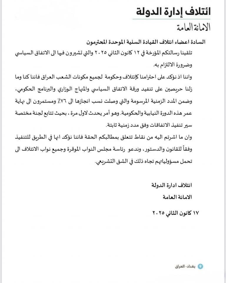 بغداد: ائتلاف إدارة الدولة يبعث رسالة إلى ائتلاف القيادة السنية الموحدة