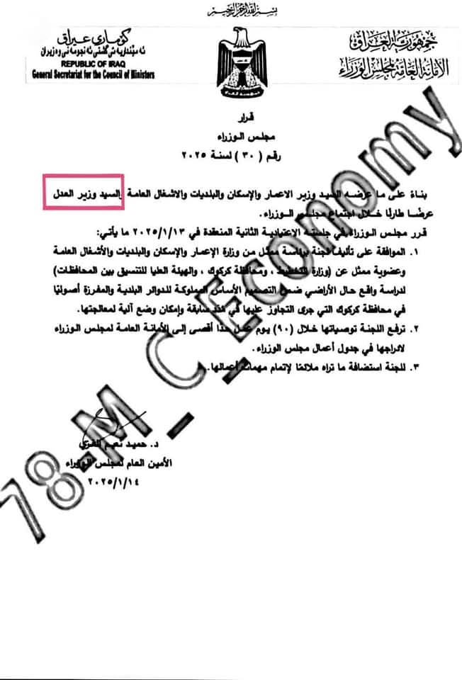 كركوك :تشكيل لجنة لمعالجة تمليك المنازل المتجاوزة في كركوك، بتوجية من وزيرالعدل